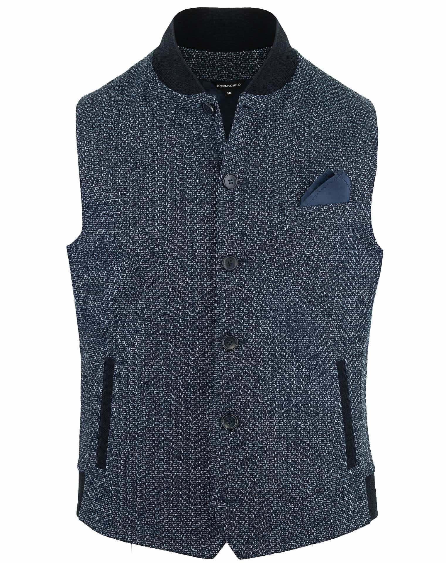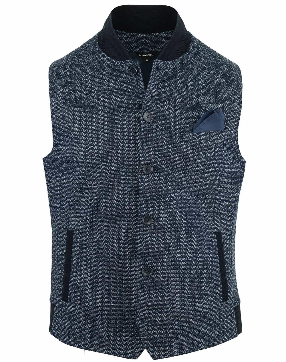In exklusiver Optik präsentiert sich die Herrenweste von Dornschild in Dunkelblau mit einem feinem hellgrauen Muster. Ob zur lässigen Jeans oder mit einer Chino kombiniert, die Weste sorgt auf Anhieb für einen smarten Look. Besondere Details sind der Stehkragen sowie der Bund aus dunkelblauem Strick, die der Weste einen sportiven Touch verleihen. Die durchgehende Knopfleiste mit den edlen Knöpfen sowie die Eingrifftaschen vollenden den urbanen Style.