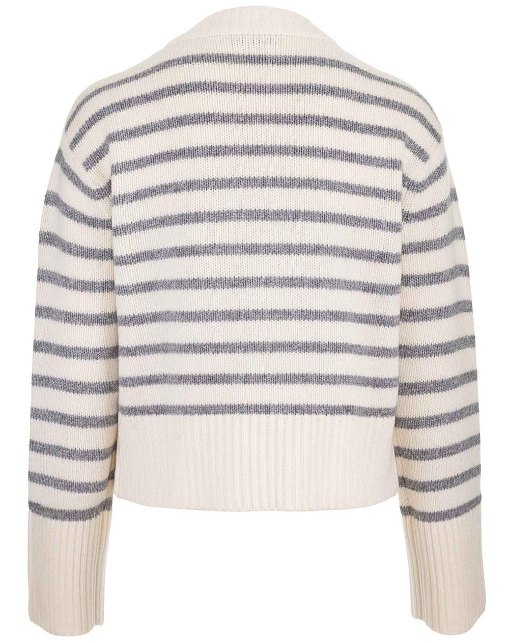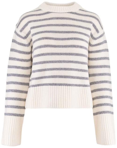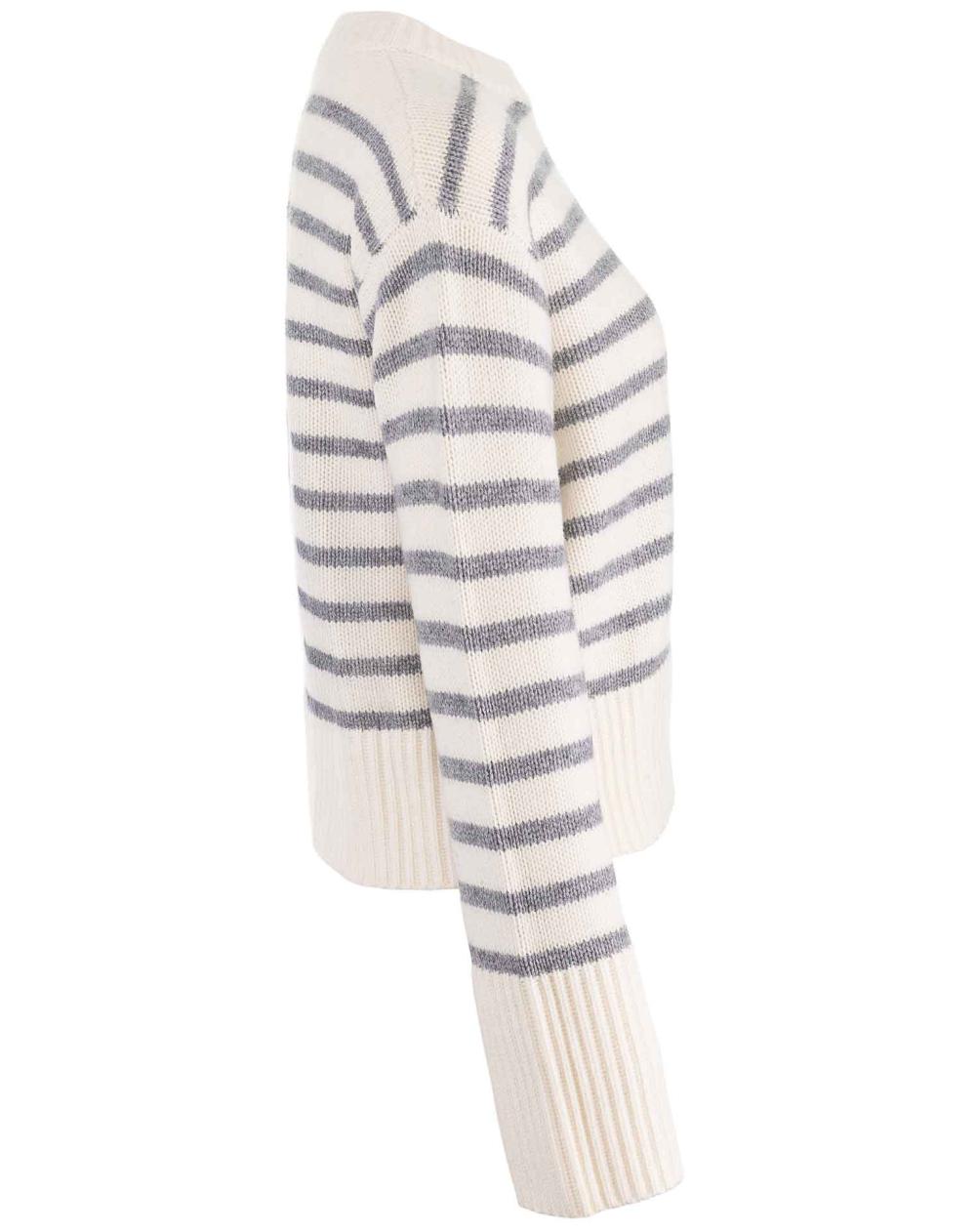 Dieser Pullover von Alcidia da Veiga vereint zeitlose Eleganz mit modischem Esprit. Gefertigt aus einem hochwertigen Wolle-Cashmere-Mix, sorgt er für ein besonders angenehmes Tragegefühl, kuschelig und luxuriös zugleich. Die verkürzte Länge macht den Pullover zum perfekten Match für High-Waist-Jeans, weite Hosen oder angesagte Röcke. In Wollweiß mit grauen Streifen ist er minimalistisch, aber keineswegs langweilig, ein modernes Understatement für jeden Tag. Der angestrickte Rundhalsausschnitt in markantem Rippstrick unterstreicht die moderne Optik und verleiht dem Pullover einen sportiven Touch. Breite Rippbündchen an Ärmeln und Saum setzen stilvolle Akzente. Die lockere, leicht kastige Silhouette macht diesen Pullover zu einem vielseitigen Lieblingsstück, ideal für entspannte Looks mit modischem Anspruch.