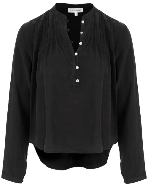 Das Blusenshirt von Bella Dahl in Schwarz ist ein vielseitiger Begleiter für jeden Tag. Gefertigt aus weich fließendem Lyocell, überzeugt diese Bluse mit einer angenehm soften Haptik. Der lockere Schnitt sorgt für entspannte Bewegungsfreiheit, während der Stehkragen die halbe Knopfleiste und die Faltendetails dem Design eine modische Note verleihen. Ob im Büro, in der Freizeit oder für den Abend dieses schwarze Blusenshirt lässt sich mühelos kombinieren und verleiht jedem Outfit eine sportive und zugleich stilvolle Optik.
