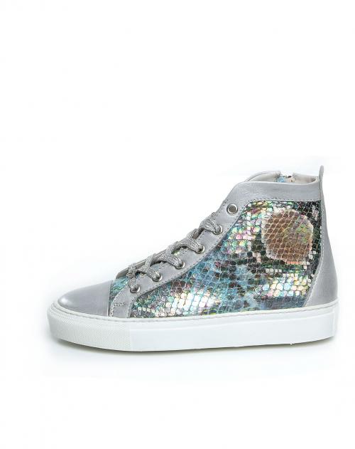Dieser Hightop Damensneaker von Gino-B ist ein echter Blickfang. Die hochwertige Verarbeitung und das angenehm weiche Leder garantieren besten Tragekomfort, der seitliche Reißverschluss sorgt für bequemes An- und Ausziehen. Das schuppenförmige Leder in schillernden Blautönen verleiht diesem Sneaker eine exklusive Optik, während die silberfarbenen Details und die glitzernden Schnürbänder das Gesamtbild perfekt abrunden. Ein absolut cooler Sneaker, der sich zu äußerst vielen Outfits bestens kombinieren lässt.
