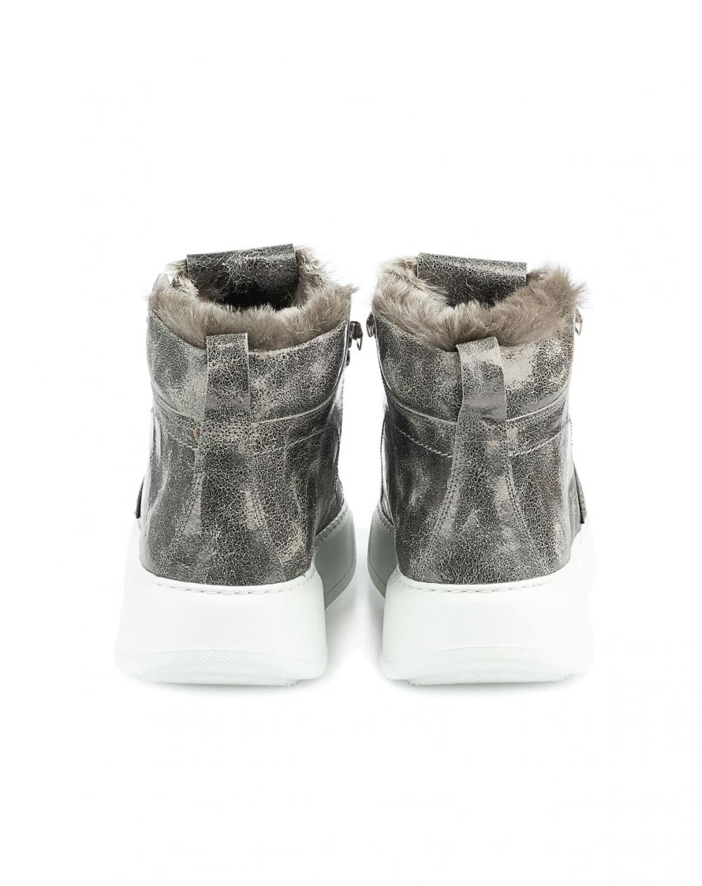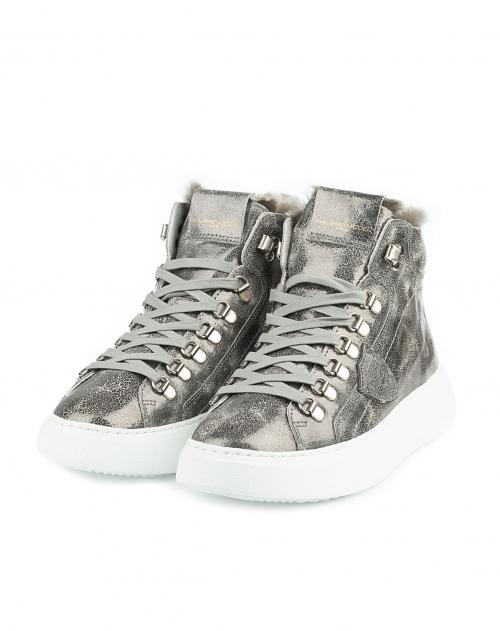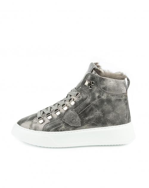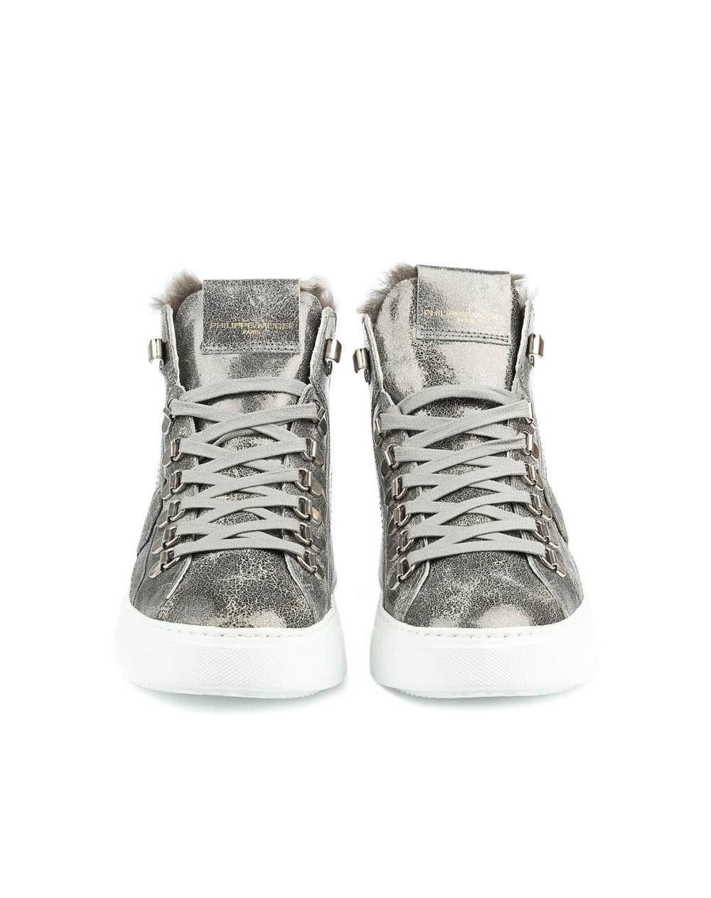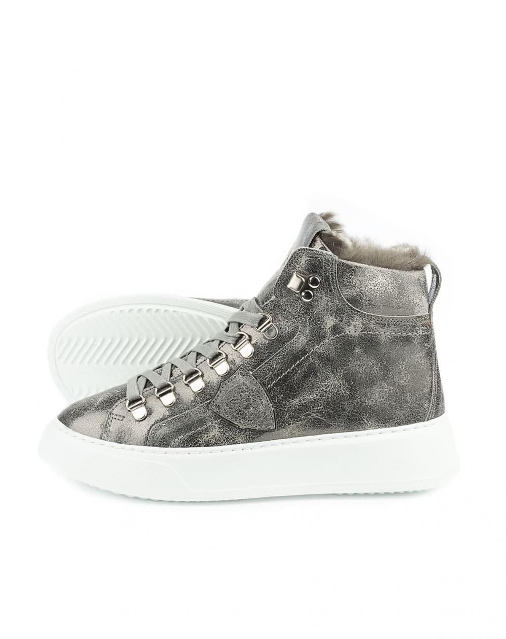 Der exklusive Damensneaker von Philippe Model ist ein perfekter Begleiter in der kühleren Jahreszeit. Das knöchelhohe Modell ist mit kuscheligem Fell gefüttert und sorgt so für herrlich warme Füße. Das Grau-Silber glänzende Leder verleiht diesem Sneaker einen luxuriösen Touch, während die Bergsteiger-Schnürung und die markante Sohle den sportlich-schicken Style lässig in Szene setzen.