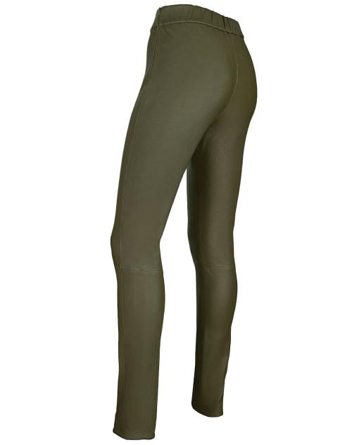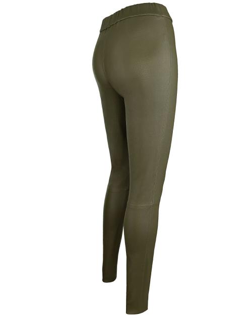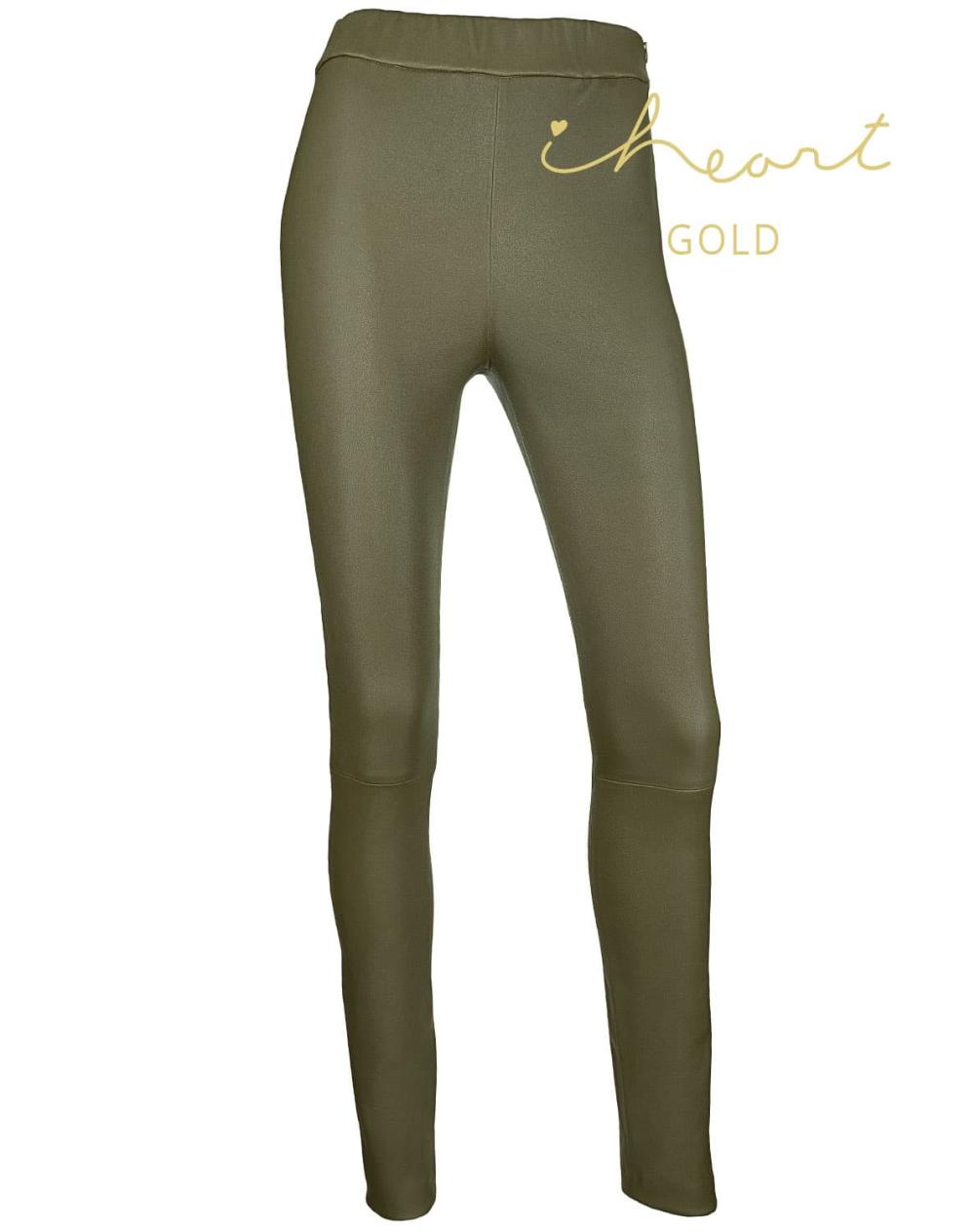 Lederleggings Maribell in Oliv von iheart. Der figurbetonte Schnitt zaubert auf Anhieb eine feminine Silhouette, während das softe Lamm-Stretchleder für optimalen Sitz sorgt. Ob lässig oder chic kombiniert, diese Lederleggings ist in jedem Fall ein Hingucker.